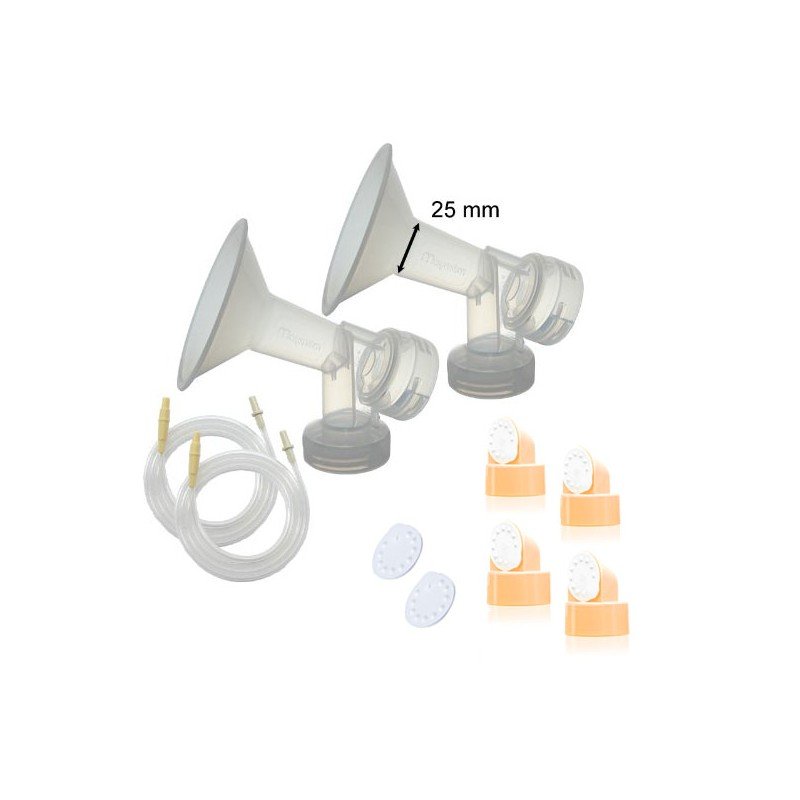 Set Maymom para extractores Medela. Set de dos embudos, 2 mangueras, 4 válvulas y 6 membranas.