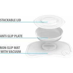 El plato y mantel antideslizante de Twistshake es ideal para evitar que tu hijo tire el plato al suelo. Gracias a su ventosa, el mantel se queda fijado a la mesa y el plato al mantel con un solo click y girando a la derecha.