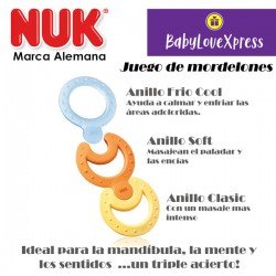 MORDEDOR NUK 3 ANILLOS COOL (3 -12 MESES) CONTIENE 3 ANILLOS UNO PARA MASAJE SUAVE, UNO PARA MASAJE MAS INTENSO, UNO PARA METER AL REFRIJERADOR Y AYUDAR A REFRESCAR LAS ENCIAS DEL BEBE.